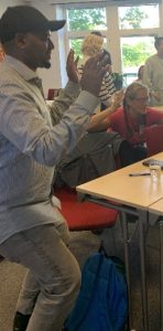 Efter en kokostopp och kaffe hade det blivit dags för inspirationsföreläsning men först laddade vi batterierna genom en rörelsepaus. Vi provade en övning från Riksidrottsförbundets Rörelsesatsning i skolan, Rörelsepaus. Vårt ord var fredagsmys!